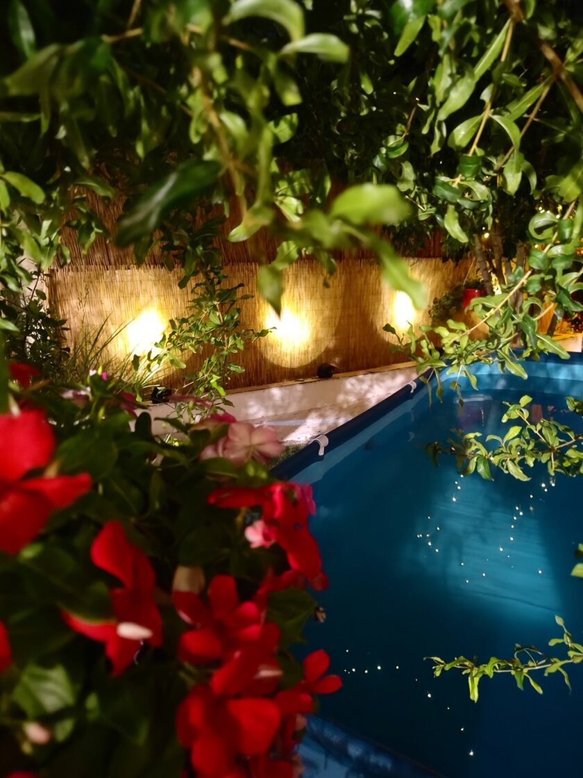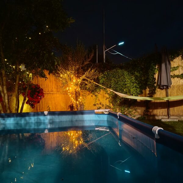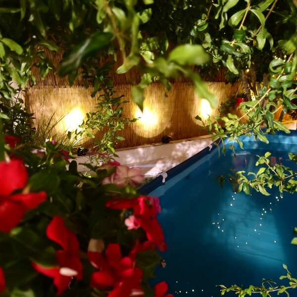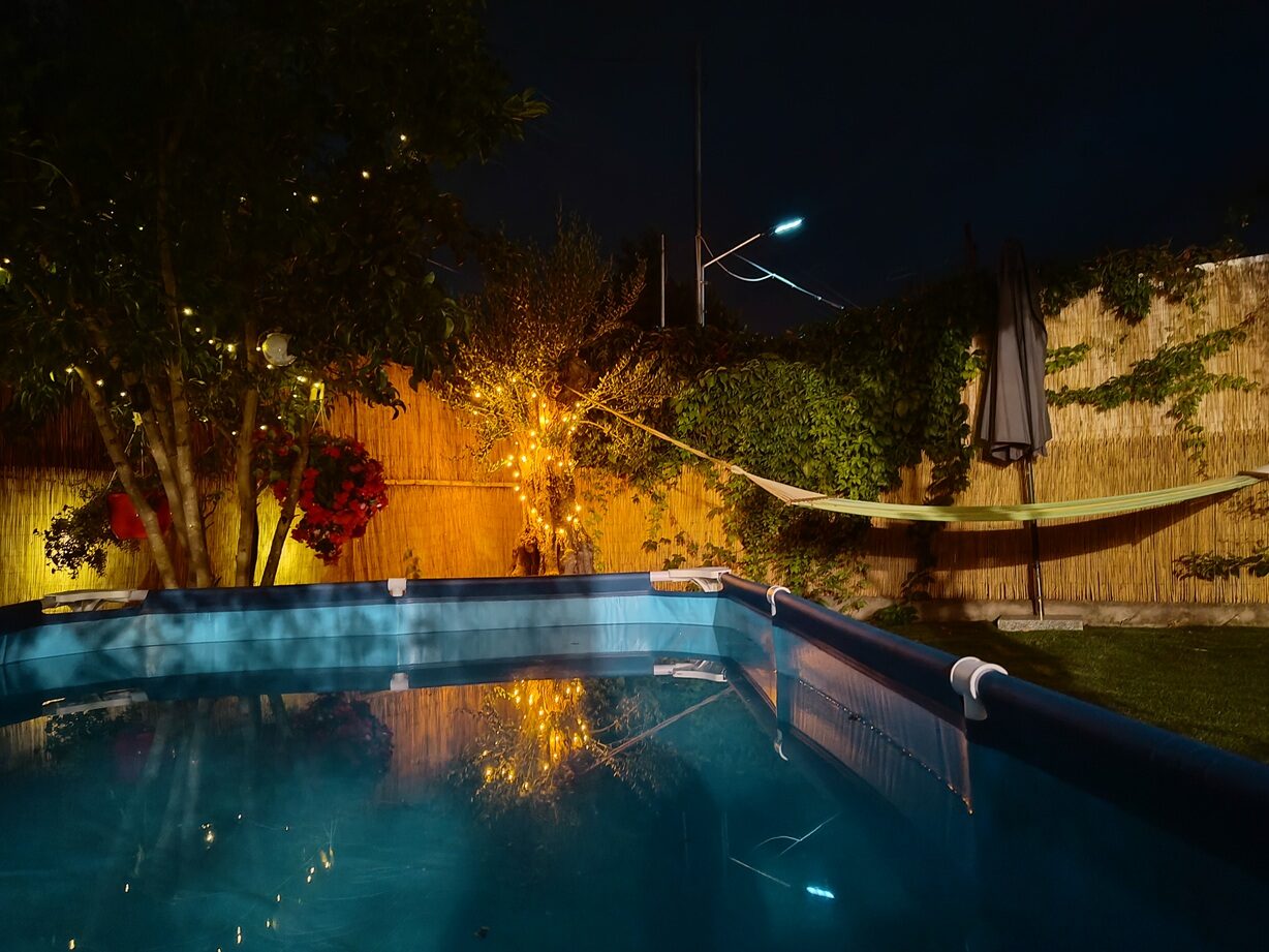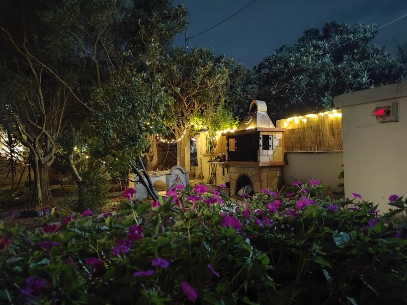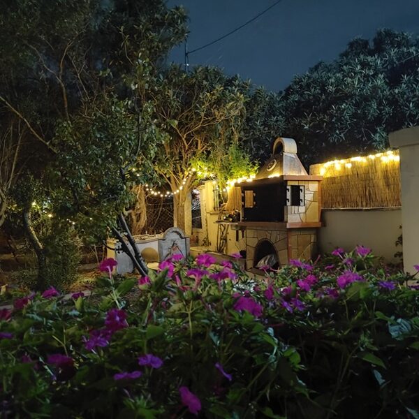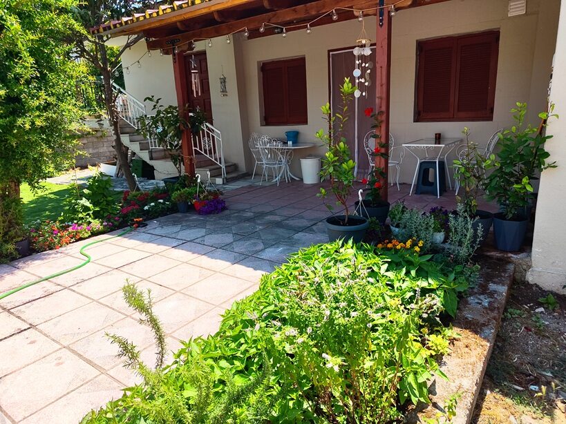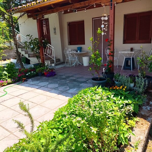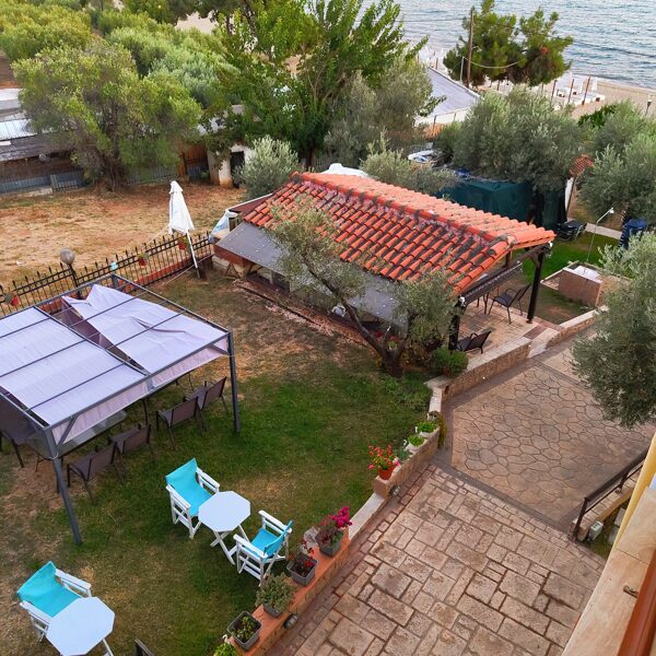 Īpašumā ir skaists dārzs ar lieliem olīvkokiem, garšaugiem, atpūtas zonu, u.t.t.. Dārzā ir āra terase ar grilu un āra virtuvi, dārzā ir vairākas nelielas terases vīna un saulrietu baudīšanai skatoties uz Olimpa kalnu pāri jūras līcim vai vienkārši labas grāmatas lasīšanai klausoties jūras viļņu un olīvkoku kopējā šalkoņā un putnu dziesmās...